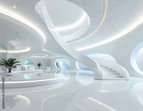 Wnętrze nowoczesnego, białego, dużego budynku o zaokrąglonych kształtach.