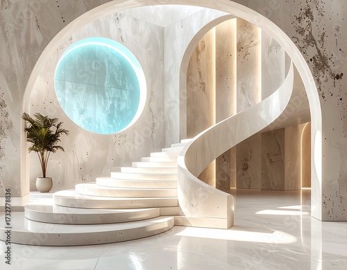 Oświetlona światłem klatka schodowa o zaokrąglonych kształtach