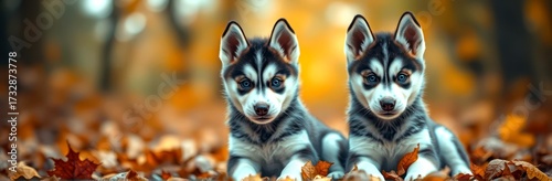 Cute Siberian Husky Puppy Twins Playing in Autumn Leaves Outdoors - Adorable Canine Companionship in Fall Nature