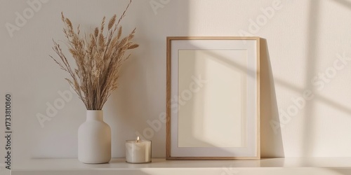 A wooden frame with a blank white card, placed on a white shelf with a vase of dried grass and a lit candle.