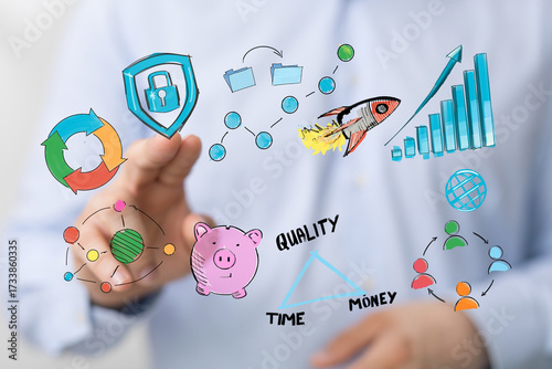Concept image illustrating business growth, strategic planning, quality, time management, and financial success.