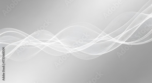 Delicate, ethereal white wavy lines forming a flowing pattern on a soft grey gradient background, abstract light art