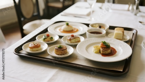 A tray of gourmet appetizers served on a dining table, featuring small plates with assorted delicacies and sauces.