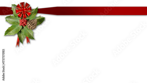 PNG. Trasparente. Illustrazione 3D. Natale. Fiocco con agrifoglio e pigna per confezione pacco regalo natalizio..