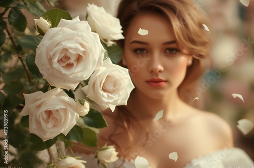 White roses with a young woman in soft focus background surrounded by blooming petals, emphasizing floral beauty and romantic sentiment in natural light