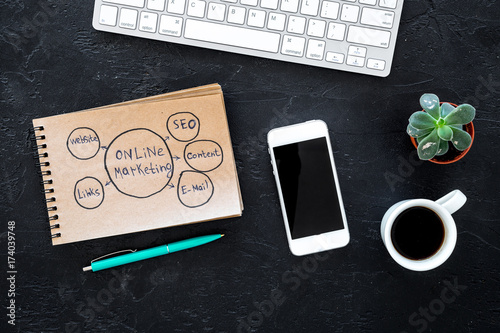 Write a business plan. Office workplace with sketch in notebook on black background top view