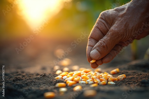 Close-up of an elderly hand sowing seeds in fertile soil at sunset, suggesting growth and agriculture