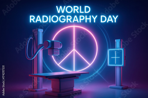 Radiology equipment with peace symbol illuminated for World Radiography Day celebration