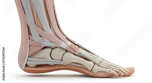 Anatomy of human foot with bones and tendons shown.