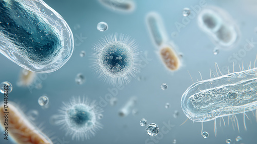 Airborne and waterborne microbes with bacteria and viral particles visualizing contamination risk and the importance of hygiene prevention and safety.