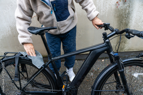 Nach der Wäsche Detailaufnahme einer Person, die den nassen schwarzen Fahrradrahmen mit einem Tuch abtrocknet