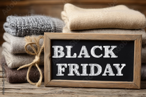 Mała tabliczka w ramce z napisem "BLACK FRIDAY" na tle stosu złożonych, ciepłych swetrów i dzianin w neutralnych, jesiennych kolorach na drewnianym stole.