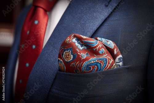 Męska marynarka w kolorze granatowym/niebieskim z czerwoną, kropkowaną krawatem i jedwabną poszetką we wzór paisley w odcieniach czerwieni i turkusu.