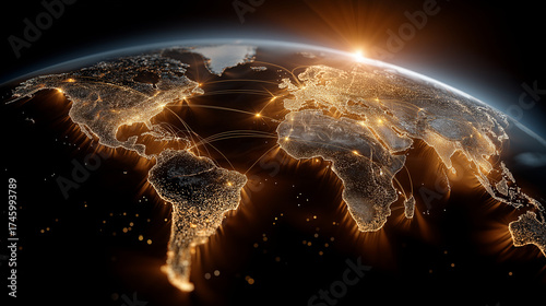 Global Connectivity at Dawn: A breathtaking view of Earth from space showcases a dazzling network of light. The interconnectedness of human civilization shines brightly against the dawn.