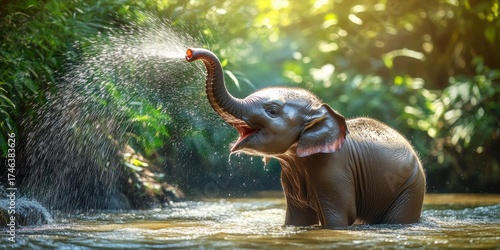Baby elephant is playing in a river, splashing water everywhere. The scene is lively and playful, with the elephant enjoying its time in the water