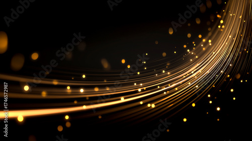 しなやかに流れる金色の光ラインと発光粒子のビジュアル