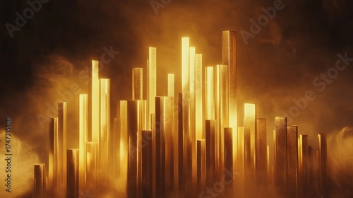 Stunning abstract gold bars shimmering with vibrant light, symbolizing wealth, success, and luxury in a dramatic, modern design.