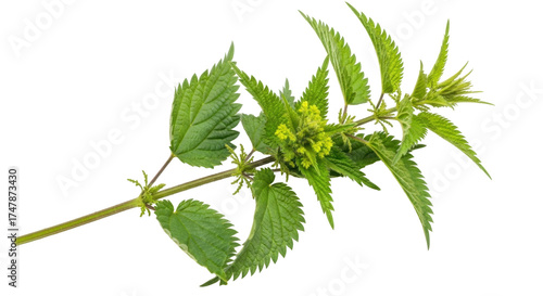 Isolated flowering stinging nettle branch against bright studio lighting, natural botany shot