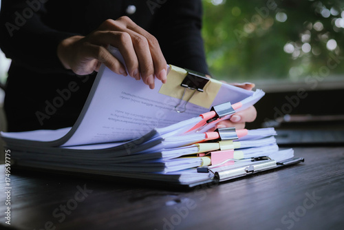 Businessperson organizing and reviewing stacks of paper documents and reports on a wooden desk in an office environment.