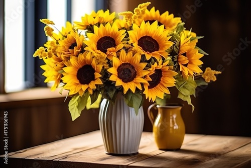 A vase filled with sunflowers, bright and cheerful, placed on a wooden table