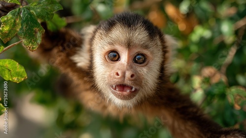 A mischievous capuchin monkey swinging acrobatically between branches grinning widely exotic pet