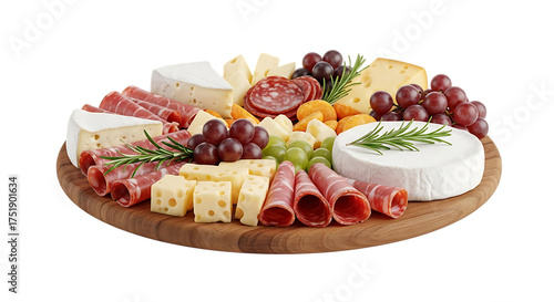 Wooden board, with assorted cheeses cured meats and grapes garnished with rosemary sprigs, isolated on white or transparent background. PNG