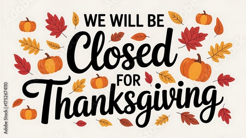 We will be closed for thanksgiving festive autumn leaves and pumpkins decorative typography sign