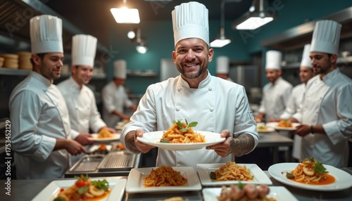 Smiling head chef proudly presents new pasta dish to camera. Kitchen staff works in background, preparing, plating food. Team of cooks creates delicious meals in busy restaurant kitchen. Culinary