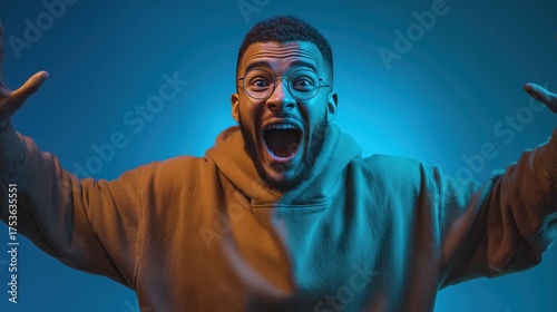 A young African man with glasses and a beard is smiling widely. He wears a brown hoodie and has his arms raised in excitement against a blue background.