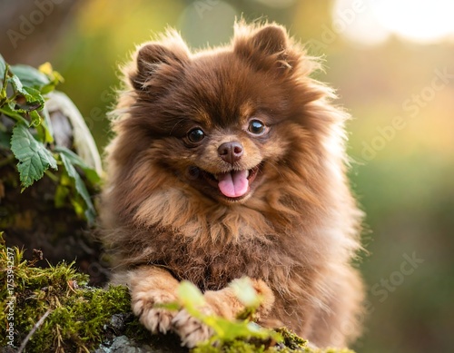 A fluffy brown dog sits on a mossy branch, smiling widely