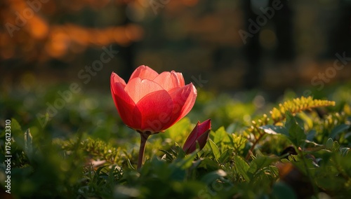 Close-up view of a vibrant scarlet blossom in a natural setting during fall with lush greenery, charming and vivid colors