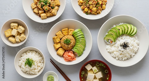 Delicious and healthy vegan Asian-inspired meal spread with various tofu dishes, rice, and fresh avocado