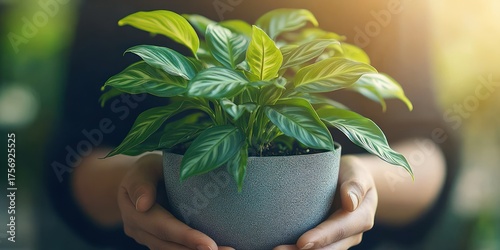 Close-up of hands gently holding a green potted plant with lush broad leaves in soft natural sunlight