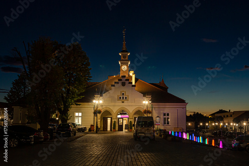Ratusz w Zakliczynie z podświetlaną fontanną nocną porą | Zakliczyn Town Hall at Night with Glowing Fountain Lights