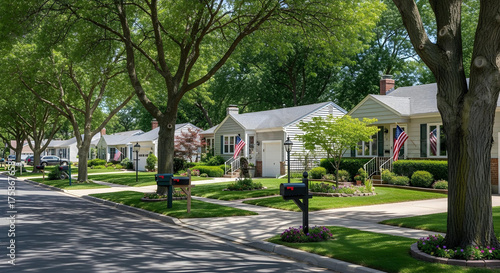 Peaceful suburban street with charming homes, trees, and bright natural light.