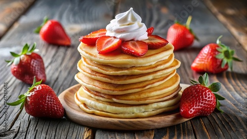 Delicious Fluffy Pancakes with Sour Cream & Fresh Strawberries on Grey Table