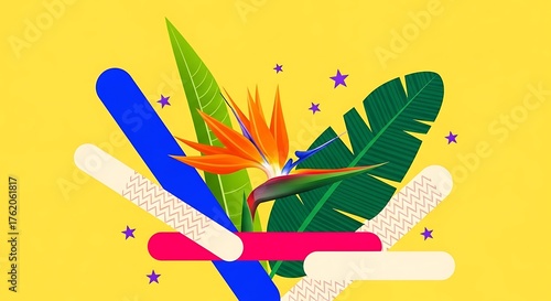 Vibrant tropical floral arrangement with colorful abstract shapes.
