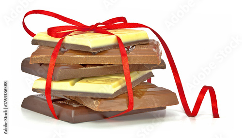 Kawałki czekolady o róznych smakach przewiązane czerwoną wstążką na białym tle