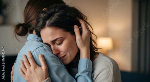 Mulher recebendo um abraço enquanto chora. Sentimentos de tristeza e medo.