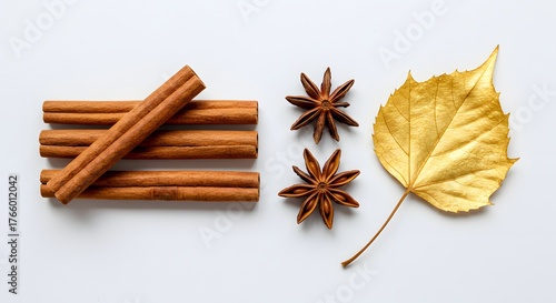 Warm autumn spices: cinnamon sticks, star anise, and gilded leaf on white background, top view