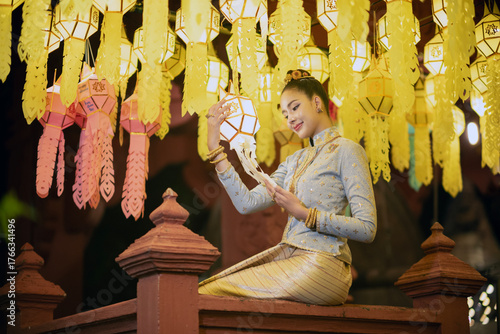 Beautiful Asian women holding a traditional paper lantern during Yi peng lantern festival at Wat Phra That Hariphunchai, Lamphun province, Thailand.