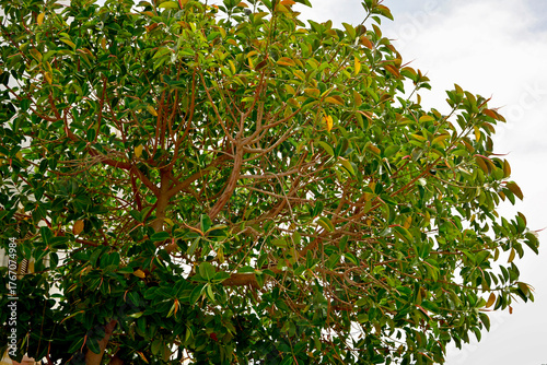 fikus sprężysty rosnący w ogrodzie, dziko rosnący fikus sprężysty, figowiec sprężysty, Ficus elastica, ficus elastica leaves close-up, rubber tree, ficus elastica growing in the garden close up