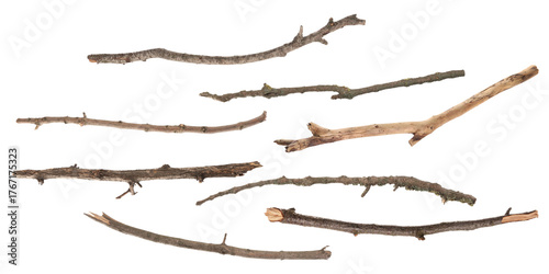 collection of natural, dry wooden sticks and broken tree branches scattered in various sizes and shapes, photographed realistically and isolated on black.