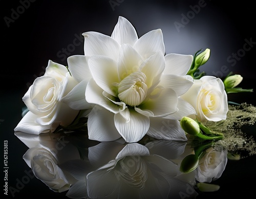 funeral or memorial flowers with a dark reflective background