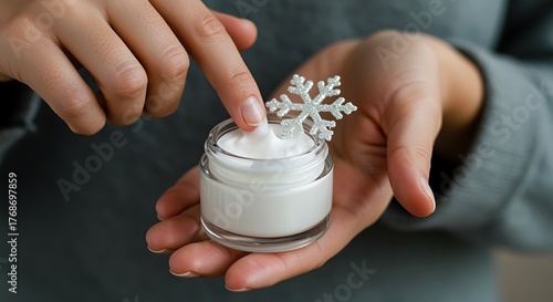 Woman applying winter cream with snowflake decoration to her finger from a small jar
