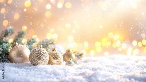 Christmas balls on snow with bokeh background, winter holiday concept