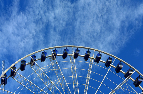 diabelski młyn na tle błękitnego nieba z białymi chmurami, duża karuzela, carousel against the blue sky, Ferris wheel against the blue sky, Children's Day, Dzień Dziecka,