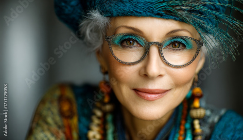 Chic older woman in vibrant style. A stylish older woman with colorful accessories smiles, reflecting her unique fashion and artistic flair.