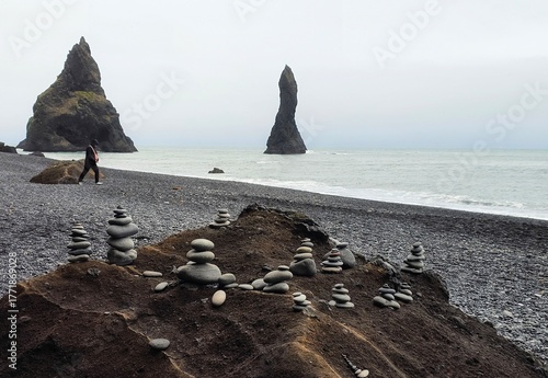 Ułożone kamienie na tle czarnej plaży i przechodzącej na niej osoby