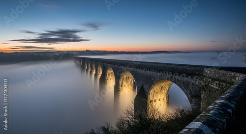 Stone viaduct shrouded in mist at dawn, illuminated by soft golden light. Dramatic, long exposure shot